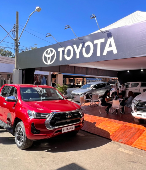 Estamos com stand unificado, que foi projetado pelos nossos parceiros da Moker. Eles são incríveis e pensaram em tudo, desde como colocar a pista off road no chão, a forma como a Hillux ia performar nela, como as pessoas iam chegar no stand e como tudo iria acontecer, nos mínimos detalhes. Agora estamos tendo essa vivência e aproveitando muito!